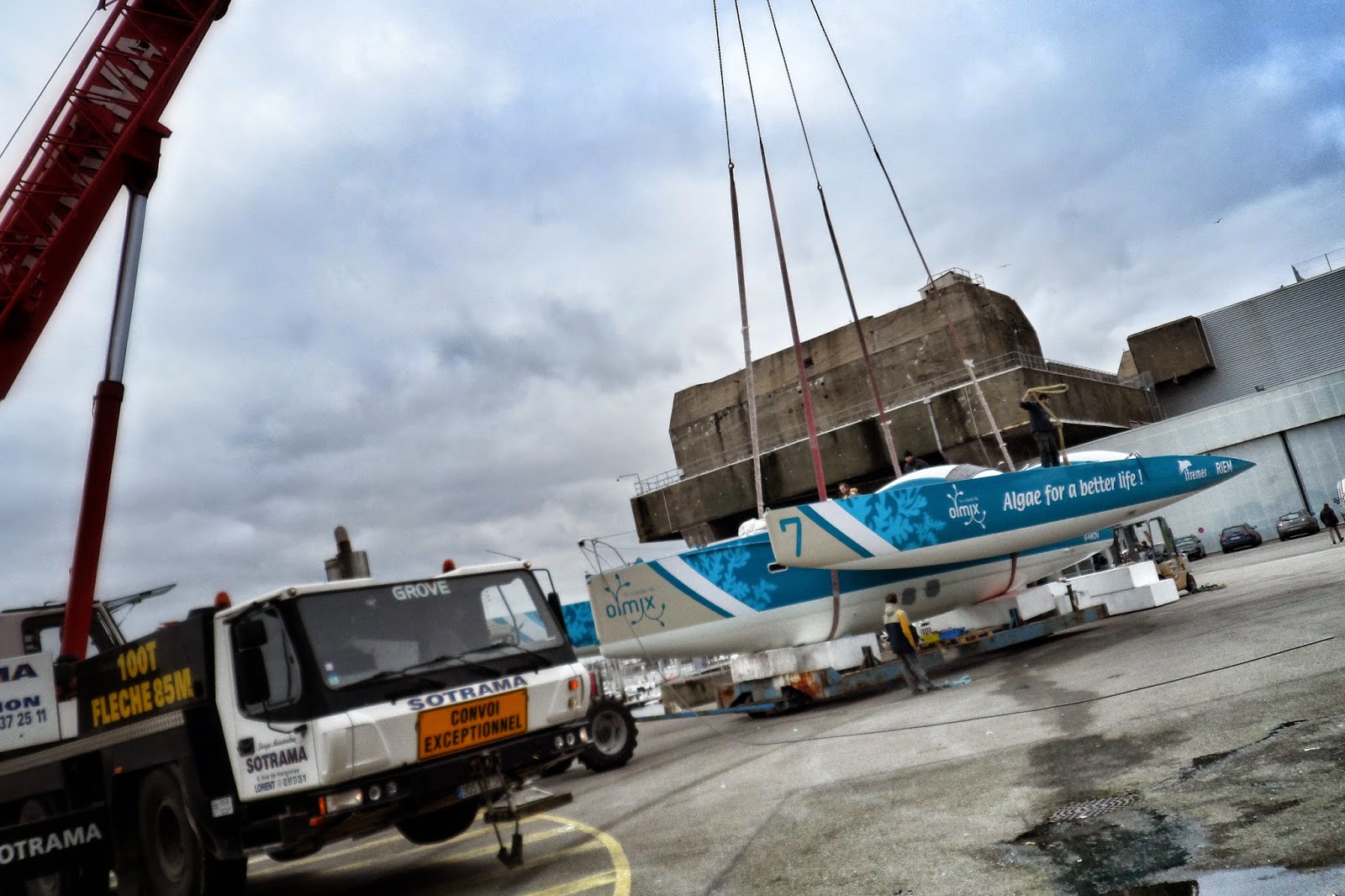 Olmix de retour à Lorient. Le Multi50 de Pierre Antoine avait été touché par la foudre sur la Route du Rhum, obligeant son skipper à quitter dans l'urgence son bateau. Arrivé d'Espagne depuis peu, le trimaran est rentré en chantier hier à la BSM.